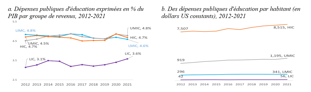 La mesure la plus directe pour évaluer si les ressources consacrées à l’éducation sont suffisantes tient au montant qu’un pays consacre à l’éducation par enfant. Bien qu’il soit difficile d’établir un point de référence pour le coût que représente l’engagement à assurer une éducation de qualité en fonction des différents pays et des différents contextes, les observations comparatives sont riches d’enseignements. Depuis 2012, les dépenses publiques par habitant ont augmenté dans les pays de tous les groupes de niveaux de revenu, mais les pays à revenu élevé, en partie en raison de la diminution de leur population en âge d’être scolarisée, ont pu allouer des montants plus importants aux dépenses par enfant (atteignant le chiffre impressionnant de $US1008 par enfant) par rapport aux pays à faible revenu (seulement $US14 par enfant), dont la population en âge d’être scolarisée continue de s’accroître.