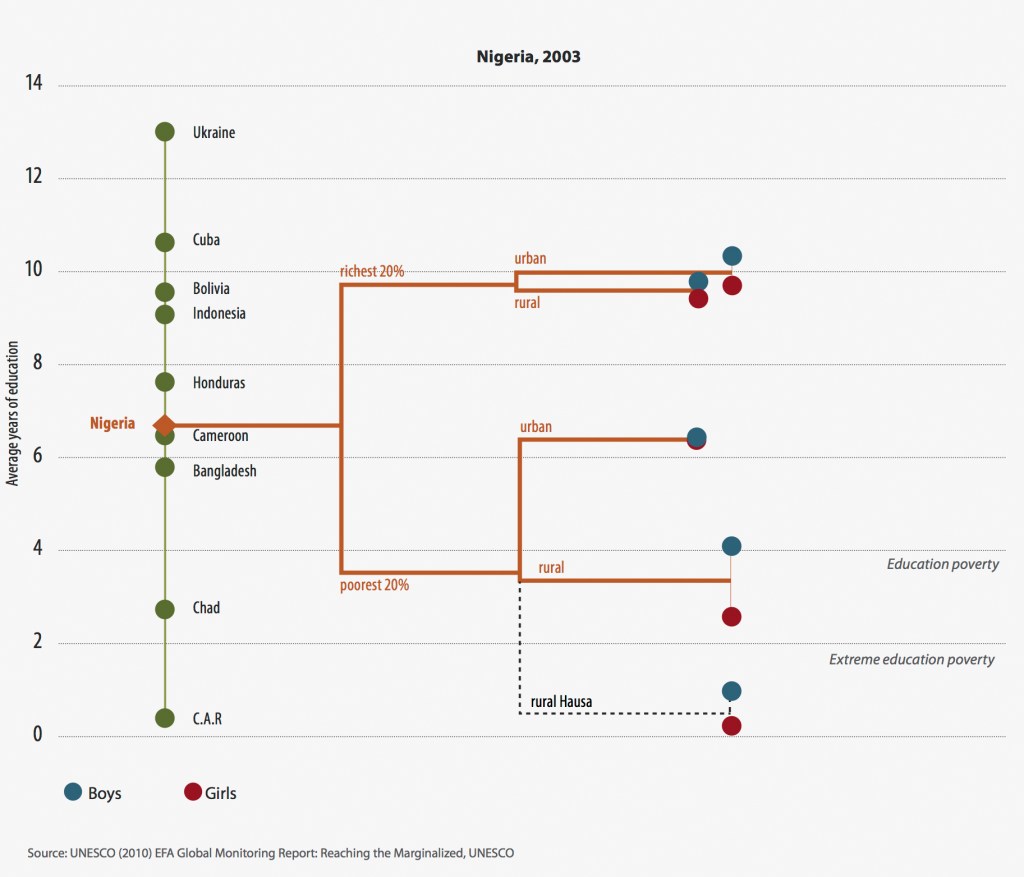 To illustrate how disadvantages linked to wealth, gender and location reinforce one another in limiting opportunities for education, the report refers to the Deprivation and Marginalization in Education database developed by the GMR team for the 2010 EFA Global Monitoring Report, Reaching the marginalized. As the figure on Nigeria reproduced in the Africa Progress Report shows (below), poor rural Hausa women aged 17 to 22 average less than one year in school, compared with over nine years for urban males from wealthy households. According to the Africa Progress Report, the number of those aged 0-14 is set to increase in Nigeria by more than 25 million over the next decade, magnifying the the challenges for education and youth employment.