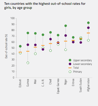 A excepción de Afganistán, todos los países que registran las tasas más elevadas de niñas sin escolarizar se encuentran en África. En 8 de estos 10 países, más de la mitad de las niñas en edad escolar están sin escolarizar, llegando al 75% en Afganistán. El mundo alcanzó la paridad de género en las tasas brutas de escolarización en la educación primaria y el primer ciclo de secundaria en 2009 y en el segundo ciclo de secundaria en 2013. Sin embargo, en África Subsahariana no hay paridad de género en ningún nivel educativo. En 2020, por cada 100 niños había 96 niñas matriculadas en la primaria, 91 en el primer ciclo de secundaria y 87 en el segundo ciclo de secundaria.