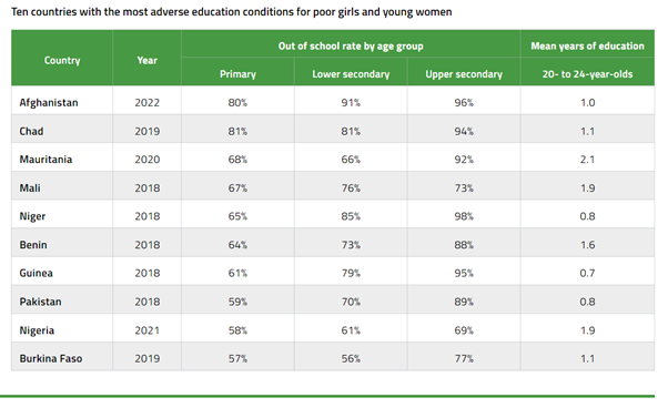 En 10 países, 7 de las 10 jóvenes más pobres en edad de cursar el segundo ciclo de secundaria no están escolarizadas. En Guinea y Malí, prácticamente ninguna joven pobre está escolarizada, lo que las coloca en la misma situación que sus hermanas afganas, a las que se prohíbe oficialmente ir a la escuela.