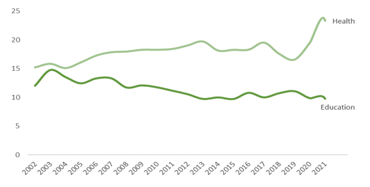 Porcentaje del sector educativo en comparación con el sanitario en la AOD sectorial, 2002-2021