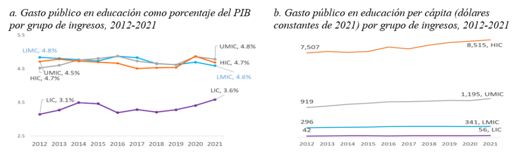 La cantidad que un país gasta en educación por niño es la medida más directa para evaluar si se dedican suficientes recursos a la educación. Aunque es difícil establecer un punto de referencia para el costo de garantizar una educación de calidad en diferentes países y contextos, las comparaciones son informativas. Desde 2012, el gasto público per cápita ha aumentado en países de todos los niveles de ingresos, pero los países de ingresos altos, en parte debido a la disminución de su población en edad escolar, han mejorado más el gasto por niño (en la impresionante cifra de 1.008 USD por niño) que los países de ingresos bajos (en sólo 14 USD por niño), cuya población en edad escolar sigue creciendo.