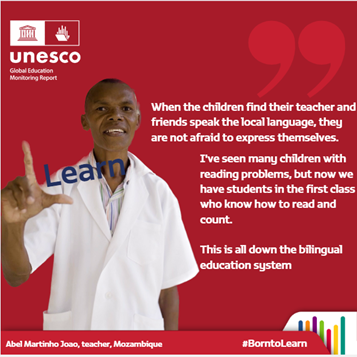 El 21 de febrero, Día Internacional de la Lengua Materna, la UNESCO hace un llamamiento a los países para que enseñen a las y los niños en su lengua materna durante los primeros años de su escolarización, que puede combinarse con la lengua oficial de enseñanza, un enfoque conocido como la educación multilingüe.