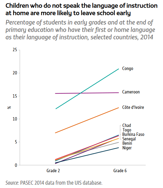 Incluso cuando existe la voluntad, el camino puede ser difícil. En África francófona, el francés se convierte a menudo en el único medio de enseñanza a partir del 4º grado o incluso del 3º, en particular por la falta de recursos financieros o humanos. Níger tenía una política clara para desarrollar escuelas bilingües en algunas partes del país, con la lengua local como principal medio de enseñanza y el francés introducido progresivamente desde el 1er grado, hasta dividir 50%-50% entre las dos lenguas en el 5º grado. Sin embargo, la falta de docentes formados llevó a algunas escuelas a eliminar por completo la lengua local y a enseñar únicamente en francés a partir del 3er grado.