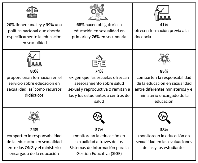- La mayoría de los países cuentan con algún tipo de marco legal de apoyo a la EIS en la educación y/o, más frecuentemente, en la salud pública. En Argentina, la Ley de Educación Sexual Integral (Ley Nº 26.150) (2006) reconoce la EIS como un derecho en los establecimientos educativos estatales y no estatales y en todos los niveles educativos. En Zambia, la Ley de Educación (2011) contiene normas “que prevén la elaboración y adopción de directrices para promover la educación sobre sexualidad, salud reproductiva, VIH y SIDA y relaciones personales en cualquier institución educativa”. En Liberia, la Ley de Salud Pública (revisada en 2019) estableció el derecho de todas y todos los adolescentes a alcanzar el más alto nivel de educación en sexualidad apropiado para su edad y sensible al género y a tomar decisiones informadas con respecto al acceso a los servicios de atención de la salud sexual y reproductiva.