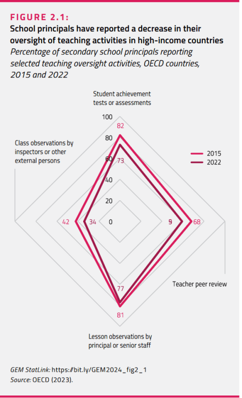 Some countries have formalized principals’ role in instructional leadership. Analysis of regulations in 211 education systems for the 2024/5 GEM report shows that 57% of countries expect principals to give teachers feedback based on observation. In the Gambia, head teachers must observe classrooms, supervise supervision and monitor staff performance, according to the School Management Manual. In North Macedonia, school directors schedule class visits and make recommendations for teachers’ professional files.