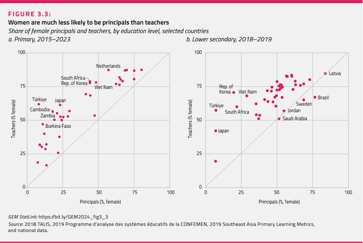 As the gender version of the global GEM Report showed, a stark gap remains: women hold 20 percentage point fewer secondary school -leadership positions across 70 countries with data despite being the majority of teachers. In Chile, for example, it is claimed that the influence of mayors in final decisions disadvantages female applicants in selection processes, and leadership training programmes have not adequately addressed gender equity. In Francophone Africa, only 16% of primary school principals are women.