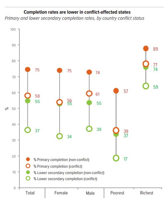 Inequalities in children’s access and progression through schooling systems are exacerbated in conflict settings. The poorest children are twice as likely to be out of primary school in conflict countries as the poorest children elsewhere. The poorest in conflict affected countries are half as likely to complete lower secondary school as in non-conflict countries as well.