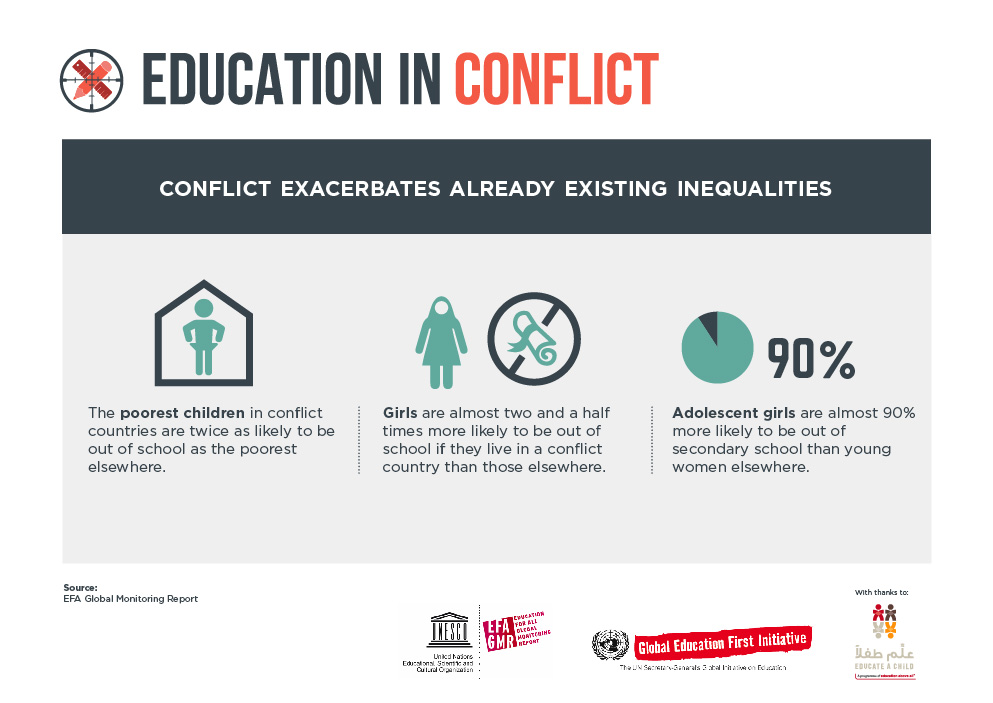 Access to education and safe learning environments urgently need to be made a priority in conflict-affected countries. Millions of children and adolescents are being deprived of their right to an education that could transform their lives. In the absence of clear policies that mitigate the damaging impact of conflict on education, the global education targets to be adopted at UN Summit on Sustainable Development in September, will not be reached by 2030.