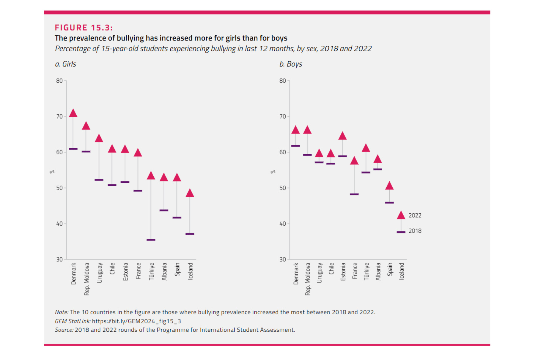 The faster increase in the prevalence of bullying for girls aligns with their higher vulnerability to cyberbullying, which is partly because, as the 2024 Gender Report on technology in education: Technology on her terms showed, girls often spend more time on social media than boys. A cross-country study of 31 high- and 11 low- and middle-income countries found that the relationship between intense social media use and being a victim of cyberbullying was more common for girls than for boys, at least partly due to the greater amount of time they spend online. In the United Kingdom, girls were more likely to report spending time on social media from the age of 10 and, at age 15, 43% of girls vs 31% of boys reported spending one to three hours a day on social media.