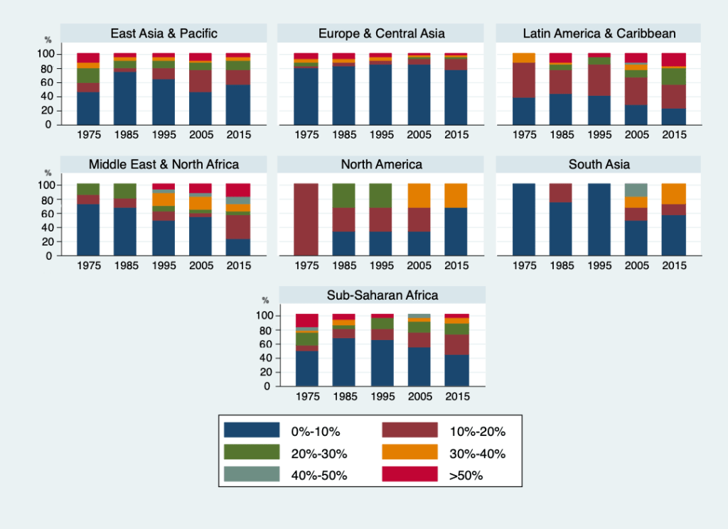 The privatization of education has evolved differently and intensified further in some regions than in others. For instance, as the figure below shows, in Latin America the percentage of countries with more than 20% of private enrolments in primary education expanded the fastest between 1975 and 2015, whereas in Europe and in Central Asia the growth concentrated among countries with 10%-20% of private enrolment.