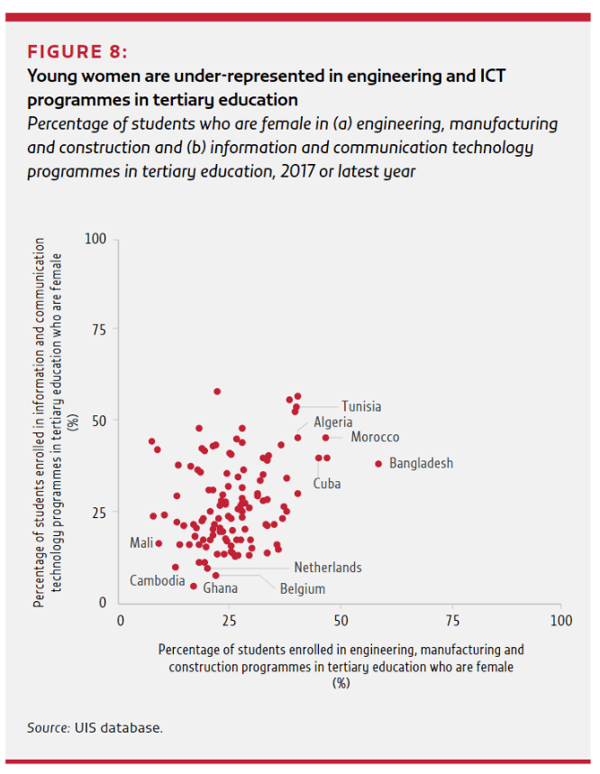 The shortage of STEM teachers is particularly acute in sub-Saharan Africa. Only around 30% of the region’s short-cycle tertiary enrolment is in STEM subjects (25% of female and 34% of male enrolments). According to an estimate produced for the 2023 GEM Report, sub-Saharan Africa is the only region where its small number of STEM graduates is insufficient to provide an adequate number of STEM teachers to meet SDG 4 needs by 2030, even if every single STEM graduate could be recruited into teaching.
