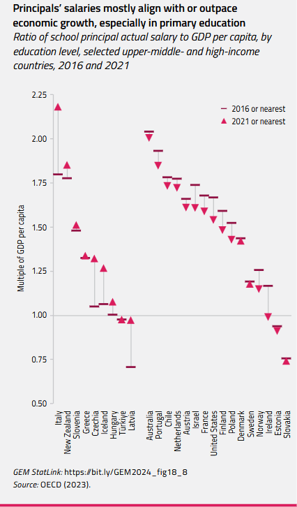 There is no global database that monitors school principals’ salaries. The best data set is from the European Union and the OECD covering their member states and a few other European countries. It shows that, in upper-middle- and high-income countries, principal salaries can vary by up to 11 times between countries and up to 2 times by education level.