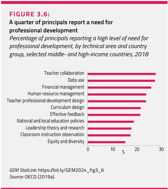 Courses are often academic, ignore career stages and skip practical skills such as data use, finance and digital tools—areas where a quarter of principals in OECD countries feel unprepared “In our rural school, we need clear dialogue, active listening, collaborative work, and effective communication as essential pillars to provide quality education to our students,” said one school leader from Uruguay – needs rarely met by current training.
