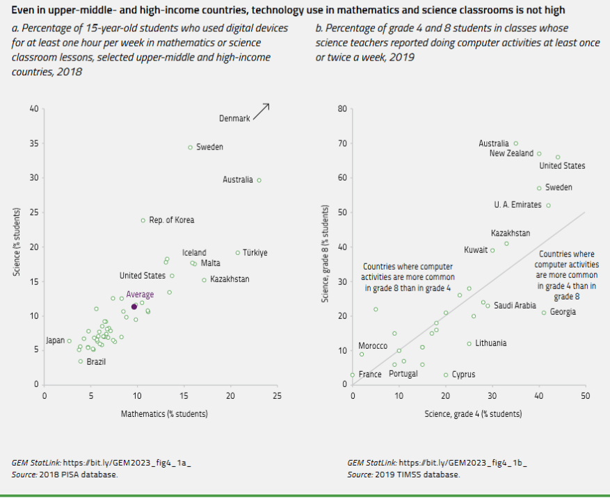 Même dans les pays les plus riches, les TIC ne sont pas utilisées fréquemment dans les salles de classe. Selon l’évaluation PISA 2018, seuls 10 % environ des élèves de 15 ans ont utilisé des appareils numériques en moyenne pendant plus d’une heure par semaine dans le cadre de cours de mathématiques et de sciences. Le Danemark est le seul pays où plus de la moitié des élèves ont déclaré utiliser des appareils numériques pendant plus d’une heure dans les deux matières. Viennent ensuite l’Australie et la Suède, avec environ un élève sur trois dans ces deux pays déclarant une telle utilisation en sciences, mais moins en mathématiques.